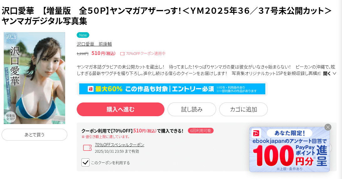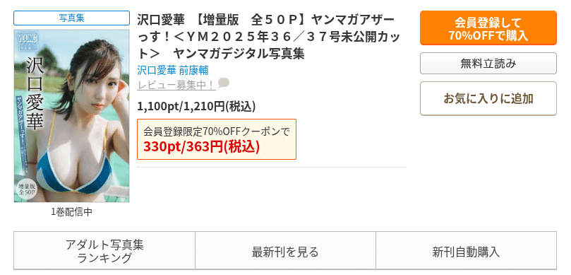 本記事では、「 沢口愛華 【増量版 全50P】ヤンマガアザーっす!<YM2025年36/37号未公開カット> ヤンマガデジタル写真集」 をできる限り安くお得に買う方法について紹介しています。
