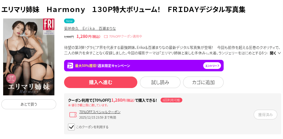 本記事では、「エリマリ姉妹 Harmony 130P特大ボリューム! FRIDAYデジタル写真集」 をできる限り安くお得に買う方法について紹介しています。