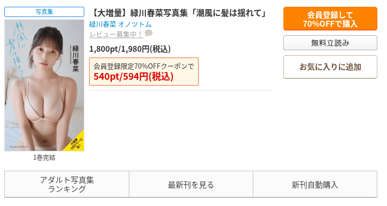 理由は、コミックシーモアの70%OFFクーポンを使うことで、緑川春菜写真集が最大70%OFFで読めるからです。