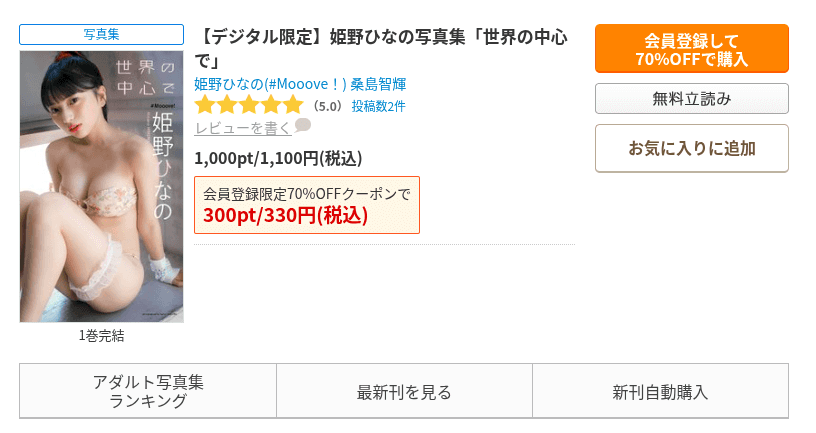 理由は、コミックシーモアの70%OFFクーポンを使うことで、姫野ひなの写真集が最大70%OFFで読めるからです。