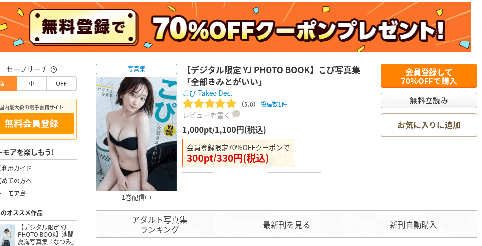 理由は、コミックシーモアの70%OFFクーポンを使うことで、こぴ写真集が最大70%OFFで読めるからです。