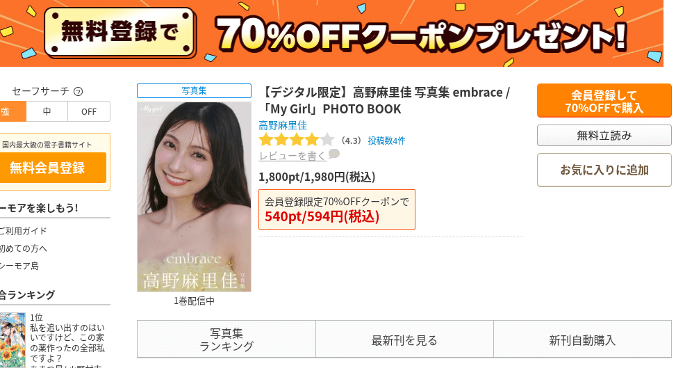 理由は、コミックシーモアの70%OFFクーポンを使うことで、高野麻里佳写真集が最大70%OFFで読めるからです。