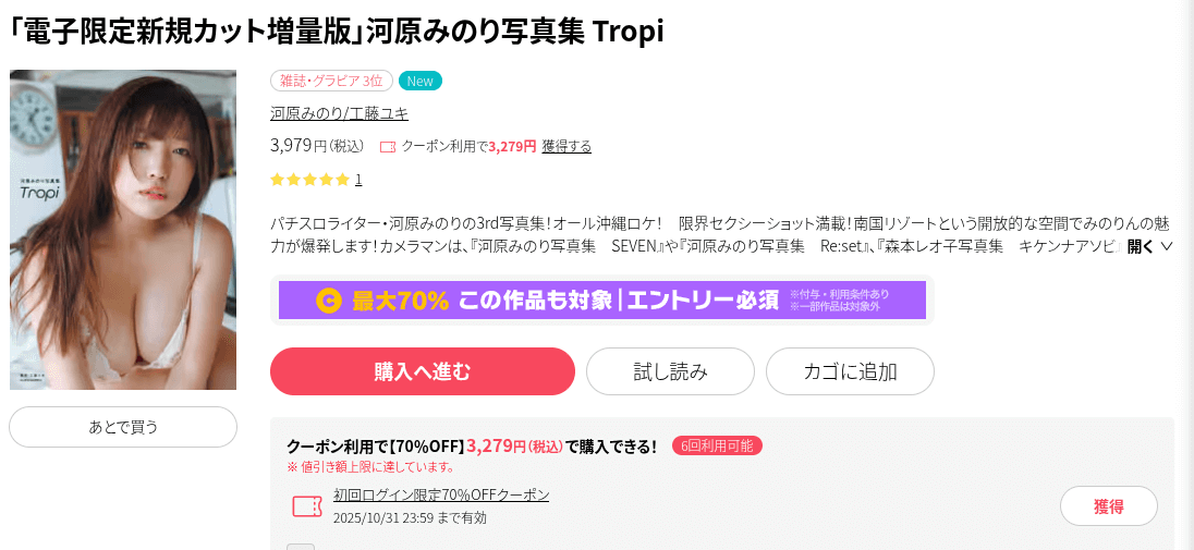 本記事では、「「電子限定新規カット増量版」河原みのり写真集 Tropi」 をできる限り安くお得に買う方法について紹介しています。