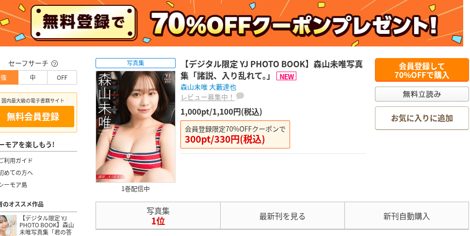理由は、コミックシーモアの70%OFFクーポンを使うことで、森山未唯写真集が最大70%OFFで読めるからです。