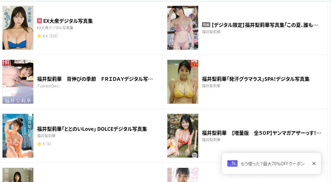 理由は、eBookJapan(イーブックジャパン)の70%OFFクーポンを使うことで、福井梨莉華(写真集)が最大700円OFF✖6回まで読めるからです。