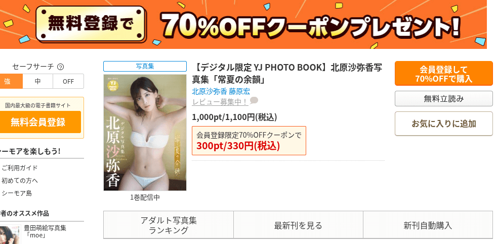 理由は、コミックシーモアの70%OFFクーポンを使うことで、北原沙弥香写真集が最大70%OFFで読めるからです。