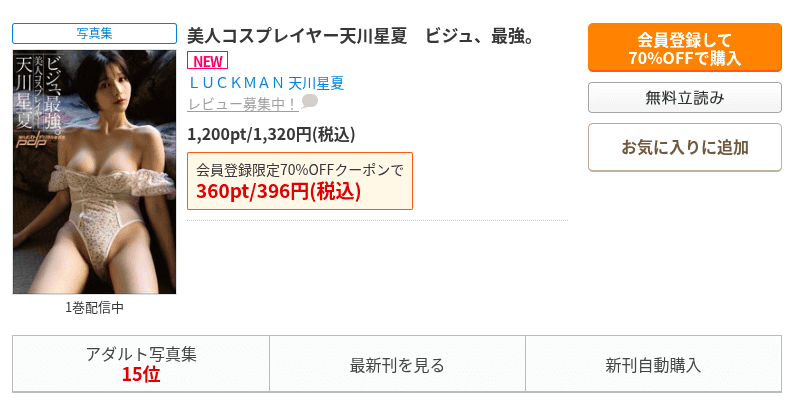 理由は、コミックシーモアの70%OFFクーポンを使うことで、天川星夏写真集が最大70%OFFで読めるからです。