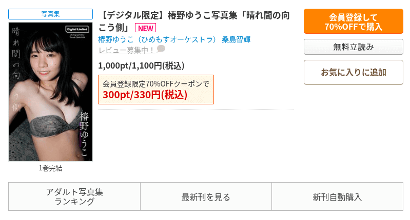 理由は、コミックシーモアの70%OFFクーポンを使うことで、椿野ゆうこ写真集が最大70%OFFで読めるからです。